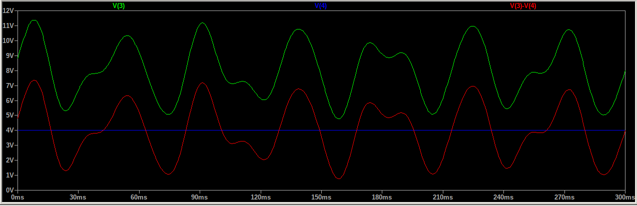 * Va 1 0 sin(8 0.4 50 0 0 -123) Vb 2 1 sin(0 1 37) Vc 3 2 sin(0 2.3 23 0 0 30) R1 3 4 100 D1 0 4 Z4V .model Z4V D(Ron=0 Roff=1Meg Vfwd=0.6 Vrev=4) .tran 1ms 0.3s .end * Tracer V(3) V(4) et V(3)-V(4) (autrement dit V(R1))