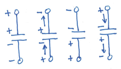 - lors des alternances négatives, elle est passante dans le sens direct (du bas vers le haut dans le schéma vertical) et permet la charge du condensateur série dans le sens correspondant (sinon il resterait constamment chargé dans le sens de la première diode et dès la deuxième alternance il n'y aurait plus de courant).