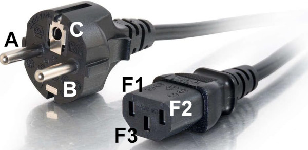 Soit un fil d'alimentation d'un appareil électrique marchant sur le secteur. Il y a deux pins (broches cylindriques) notées A et B sur la prise et un trou (une broche noyée) noté C d'un côté et trois (broches noyées) fils de l'autre côté avec une cosse notés F1, F2 et F3. En se mettant sur le mode bip (test de continuité avec buzzer) du multimètre, on teste tous les couples possibles : X pas de bip, V un bip.